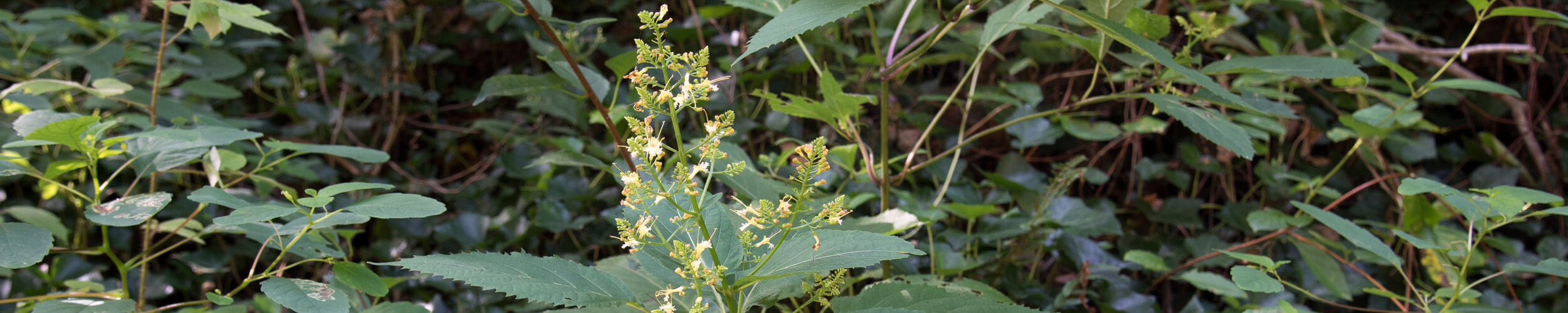 - Collinsonia canadensis is a perennial herb native to eastern North America, typically found in woodland edges, shady slopes, and moist forests. It features lance-shaped green leaves and tall, flowering spikes with clusters of small, yellowish-green flowers.